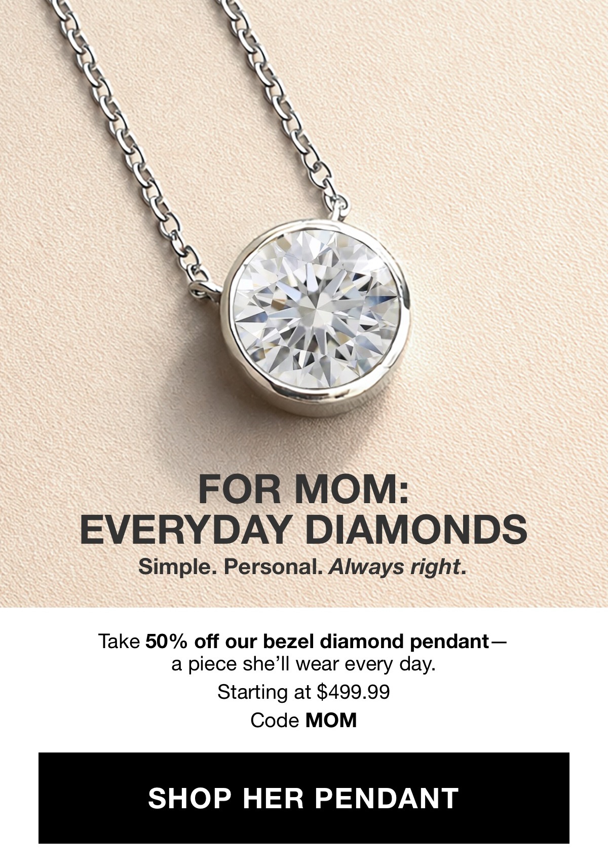Terms & Conditions: Sale valid on select lab-grown diamond bezel set pendants. Offer price reflects discount applied with code MOM at checkout. Valid through Sunday 4/19 at 11:59 PM ET or while supplies last, whichever occurs first. Limited quantities available; styles may sell out and will not be restocked. Offer cannot be combined with other promotions, discounts, or previous purchases. Not valid on custom orders. Prices and availability subject to change without notice.