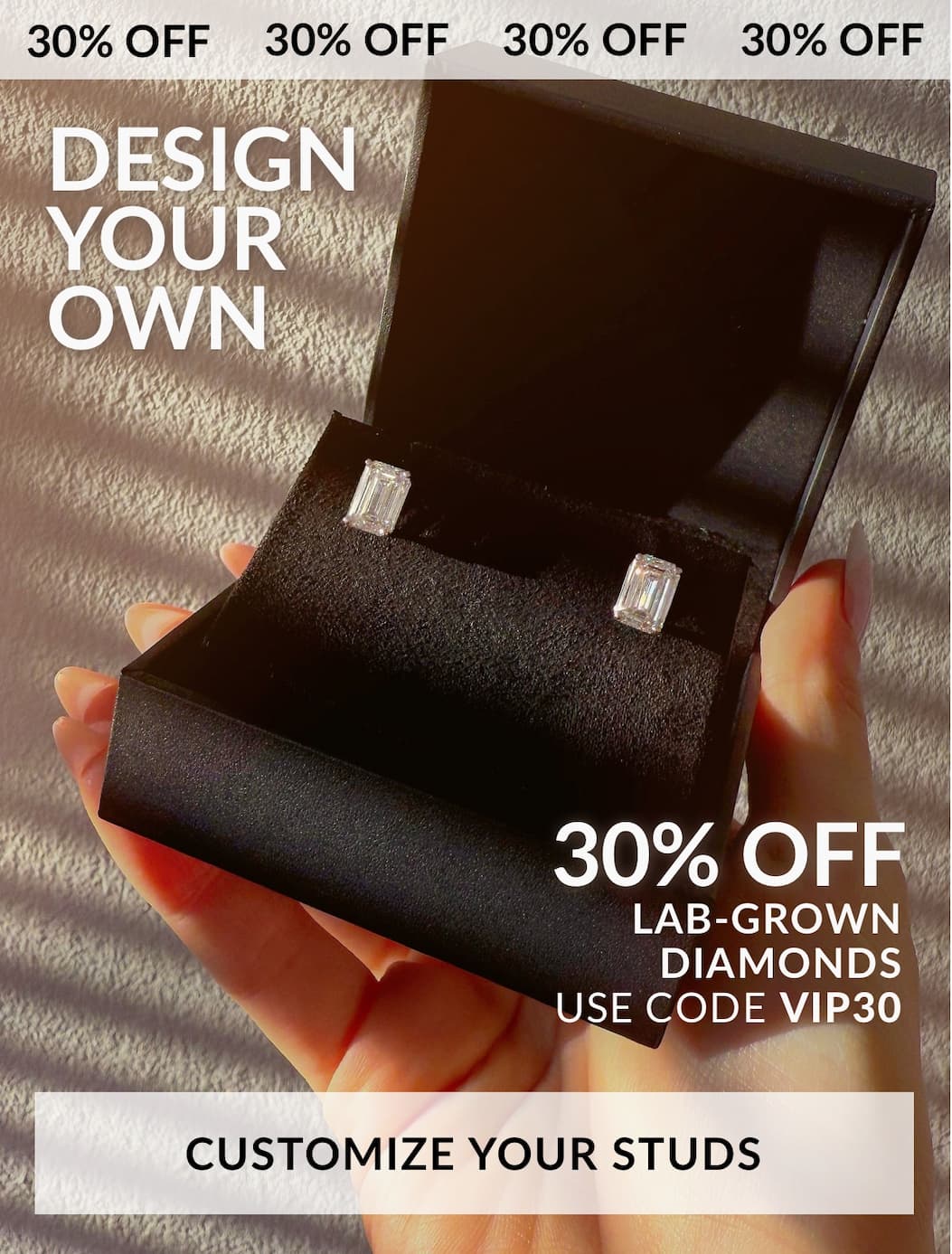 Terms & Conditions: Save 30% on your Lab Grown Diamond or Engagement Ring purchase with code VIP30. No minimum purchase required. Excludes Natural Diamonds, Jewelry, Wedding Rings,Custom Engagement Rings, Custom Wedding & Eternity Rings, Custom Jewelry, Design Your Own Pendant & Earring Baskets. Offer cannot be combined with other promotions, discounts, or offers. The promotion is applicable only to eligible items and cannot be applied to taxes, shipping, or any other additional charges that may apply. Promotion is valid through Wednesday, January 14, 2025 at 11:59 PM EST.