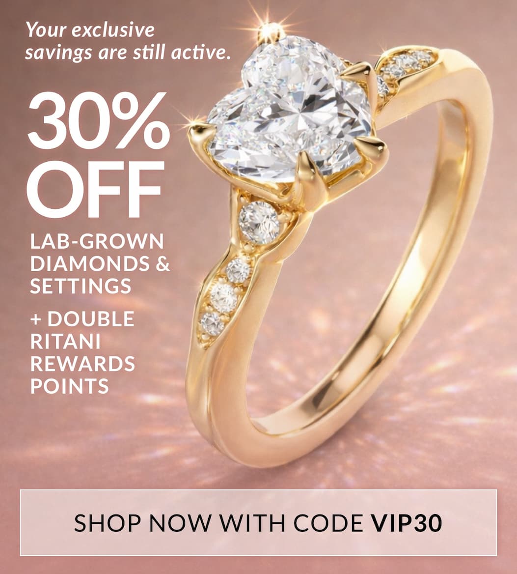 Terms & Conditions: Save 30% on your Lab Grown Diamond or Engagement Ring purchase with code VIP30. No minimum purchase required. Excludes Natural Diamonds, Jewelry, Wedding Rings,Custom Engagement Rings, Custom Wedding & Eternity Rings, Custom Jewelry, Design Your Own Pendant & Earring Baskets. Offer cannot be combined with other promotions, discounts, or offers. The promotion is applicable only to eligible items and cannot be applied to taxes, shipping, or any other additional charges that may apply. Promotion is valid through Wednesday, January 14, 2025 at 11:59 PM EST.