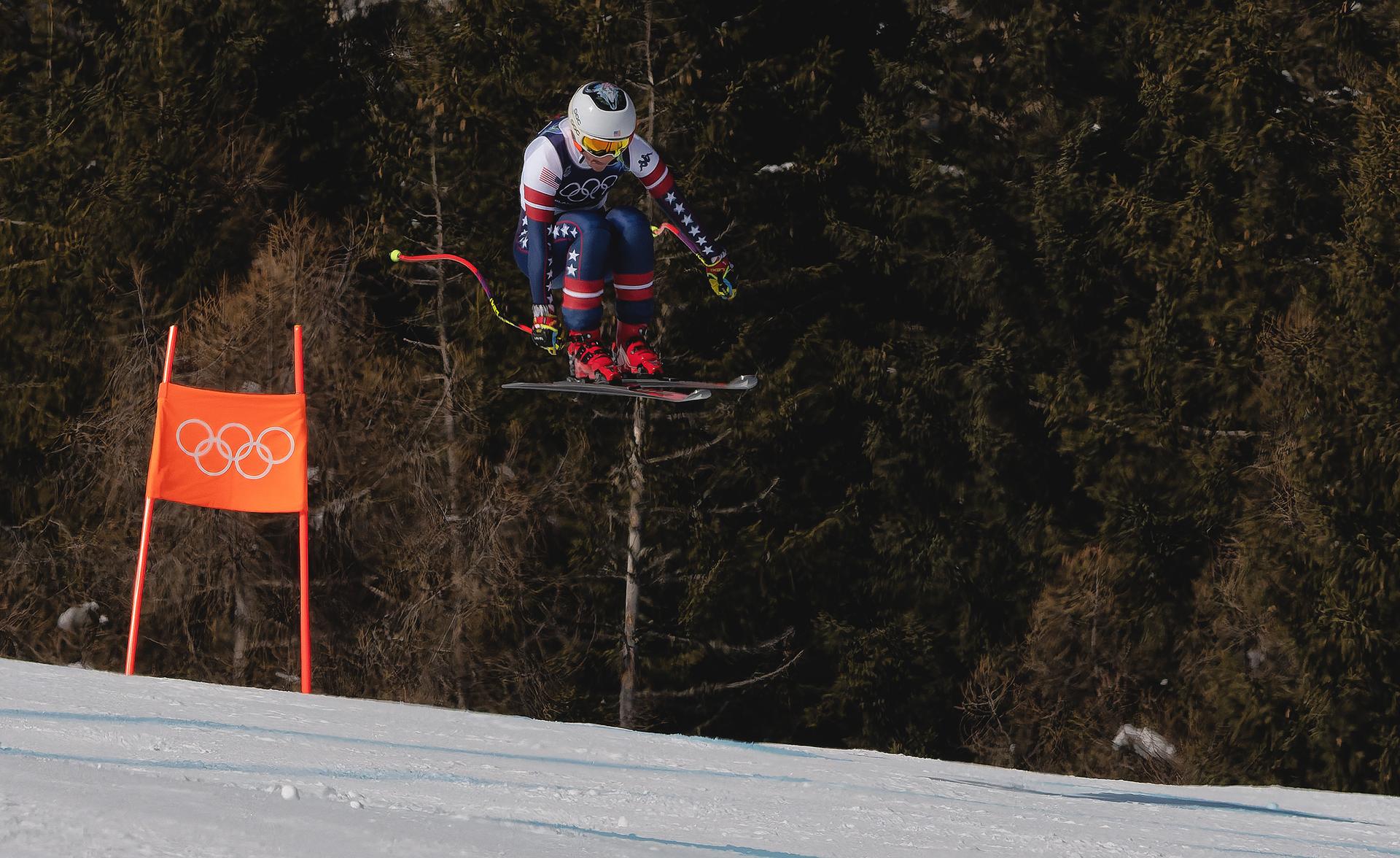 American skier Breezy Johnson goes airborne en route to a gold medal performance. |