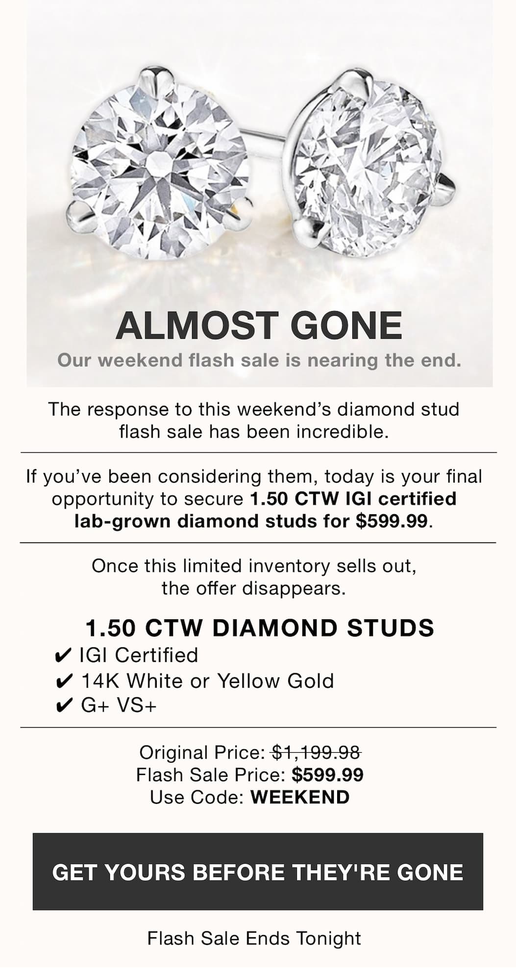Terms & Conditions: Save 50% on your IGI Certified 1.50 Carat GVS Round Cut Lab-Grown Diamond Three-Prong Martini Stud Earrings in 14kt White Gold or 14kt Yellow Gold with code WEEKEND. No minimum purchase required. Offer valid while supplies last. Offer cannot be combined with other promotions, discounts, or offers. The promotion is applicable only to eligible items and cannot be applied to taxes, shipping, or any other additional charges that may apply. Offer valid through Monday, March 8, 2026 at 11:59 PM EST. No longer want to receive these emails? | | | | |
